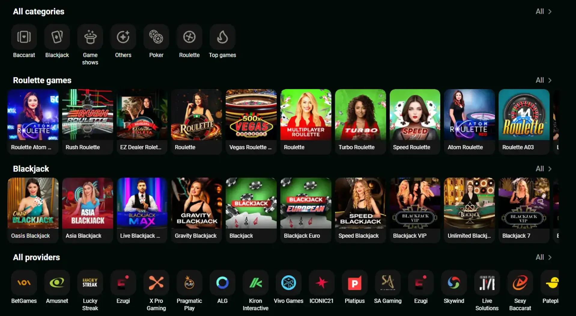 ✔️ Huge Game Variety – Slots, table games, live dealers, jackpots, and special categories all in one place.